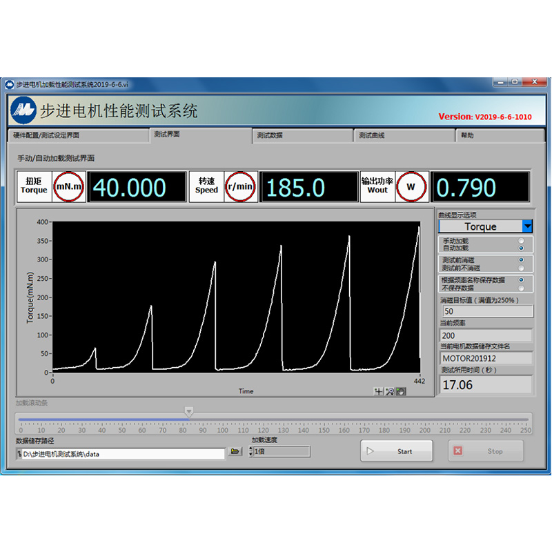 C0-MTHD- S100KT步進(jìn)電機測試系統(tǒng)用于測試步進(jìn)電機在不同頻率下的失步力矩,本系統(tǒng)實現(xiàn)了對步進(jìn)電機多種模式的控制,能夠?qū)崟r采集、存儲電機的電壓和電流、扭矩、轉(zhuǎn)速、功率等信號,并對數(shù)據(jù)分析處理以判斷電機運轉(zhuǎn)狀態(tài)。